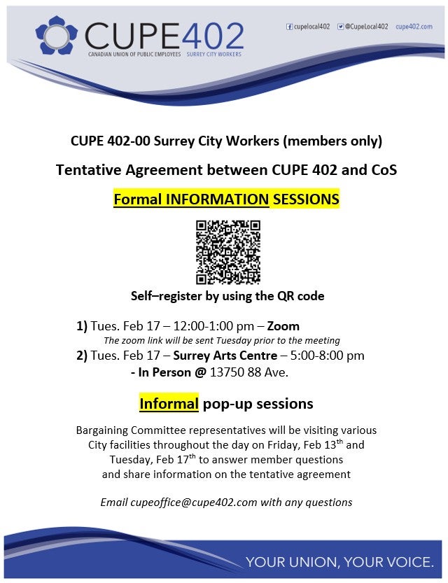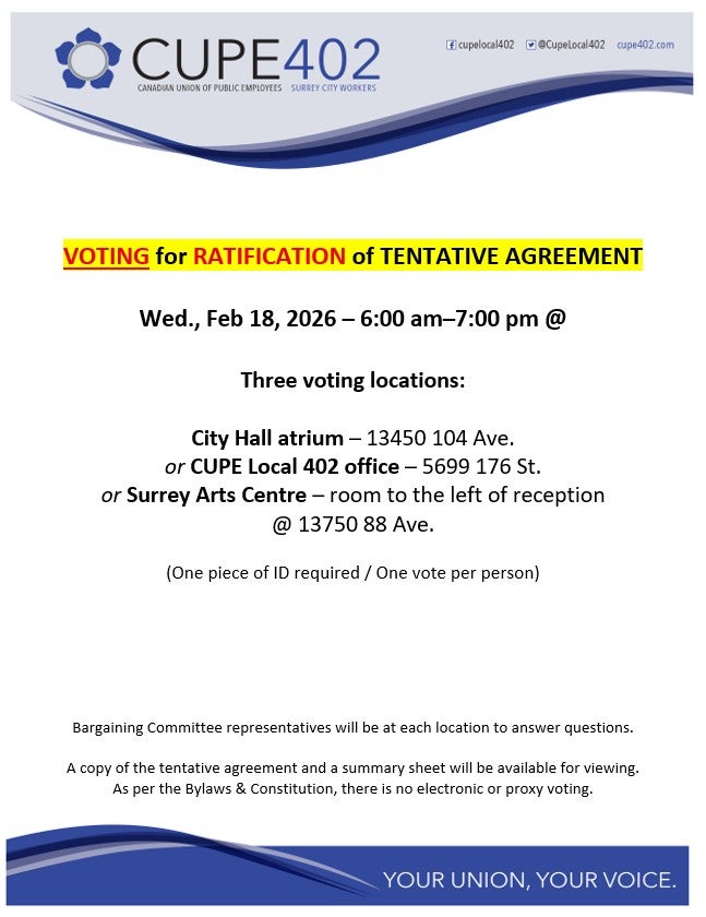 Tentative Agreement between CUPE 402 and City of Surrey Posted on February 13, 2026 by cupe402office Share this: Click to share on Facebook (Opens in new window) Facebook Click to share on X (Opens in new window) X