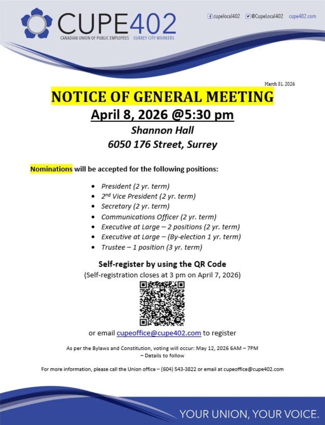 General Meeting April 8, 2026 @5:30pm Posted on March 31, 2026 by cupe402office Share this: Click to share on Facebook (Opens in new window) Facebook Click to share on X (Opens in new window) X