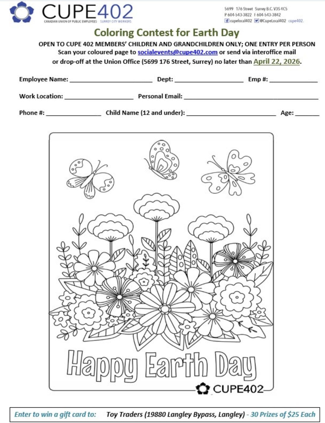 Earth Day Coloring Contest 2026 Posted on April 17, 2026 by cupe402office Share this: Click to share on Facebook (Opens in new window) Facebook Click to share on X (Opens in new window) X
